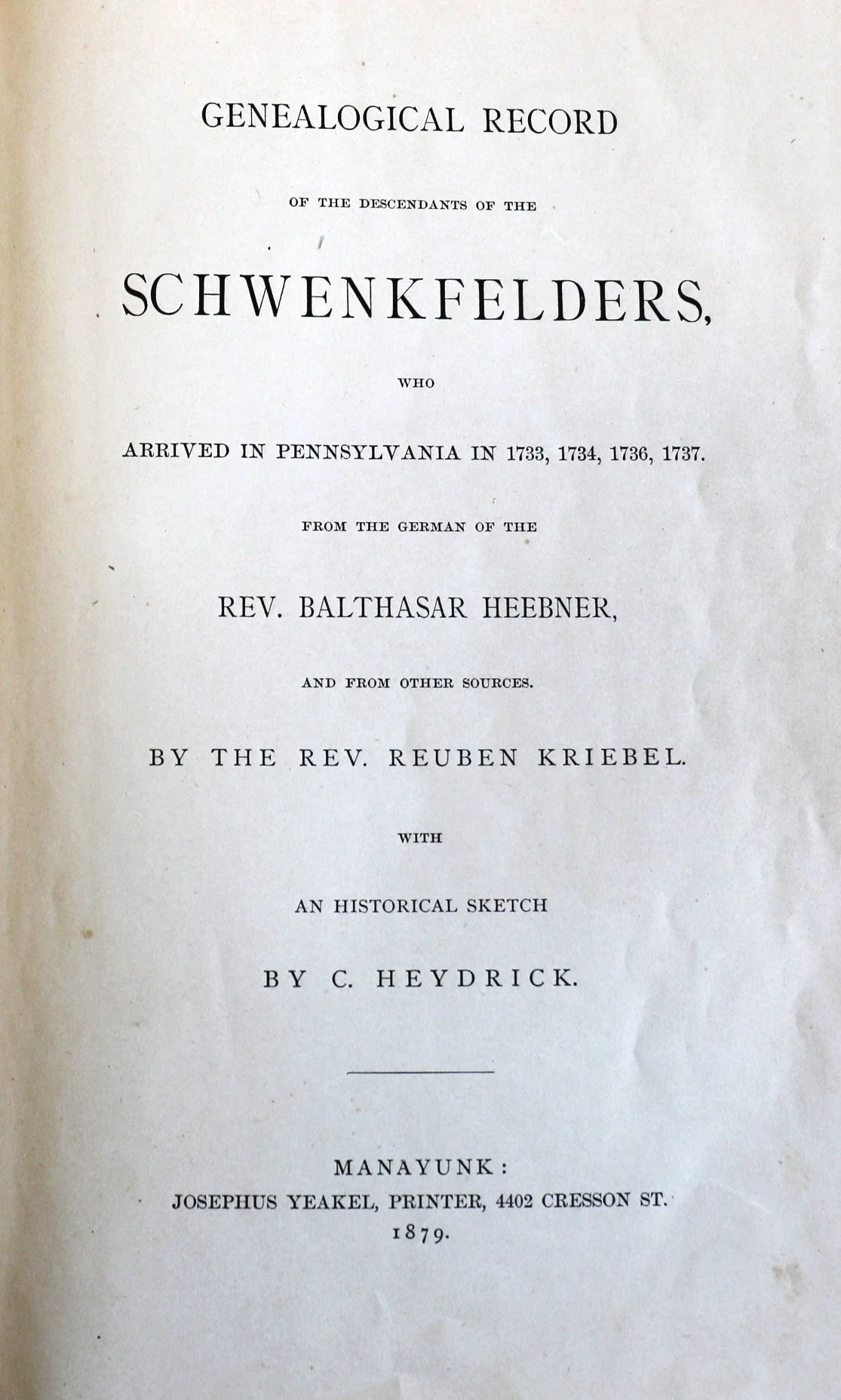 Cover page of 1879 Genealogical Record by Rev. Reuben Kriebel